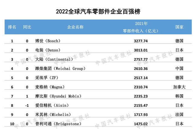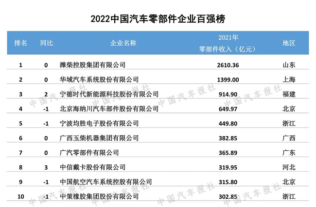 On September 22, 2022, the "2022 Global Automotive Supply Chain Key Enterprise Competitiveness White Paper" and the top 100 list were released online. Weichai Group ranked first in the "2022 Top 100 Chinese Auto Parts Enterprises" with an operating income of 261.036 billion yuan in the parts and components sector in 2021, ranking first for six consecutive years. Weichai also ranked in the "2022 Top 100 Global Auto Parts Enterprises", and it is the only Chinese company to enter the top 10 of the list.